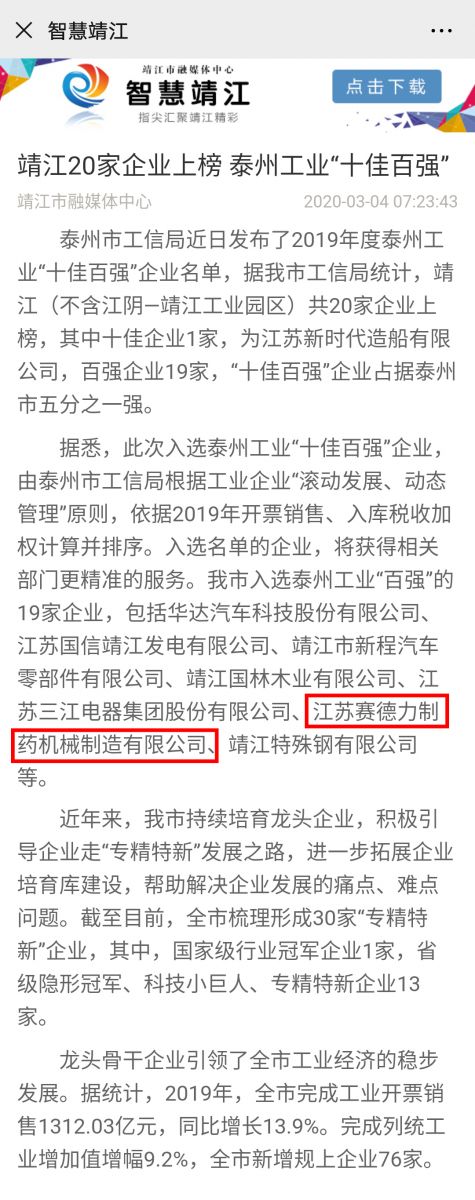 泰州市工信局近日發(fā)布了2019年度泰州工業“十佳百強”企業名單,