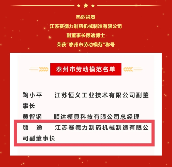 喜報!熱烈祝賀我司副董事長顧(gù)逸榮(róng)獲“泰州市勞動(dòng)模(mó)範”稱號