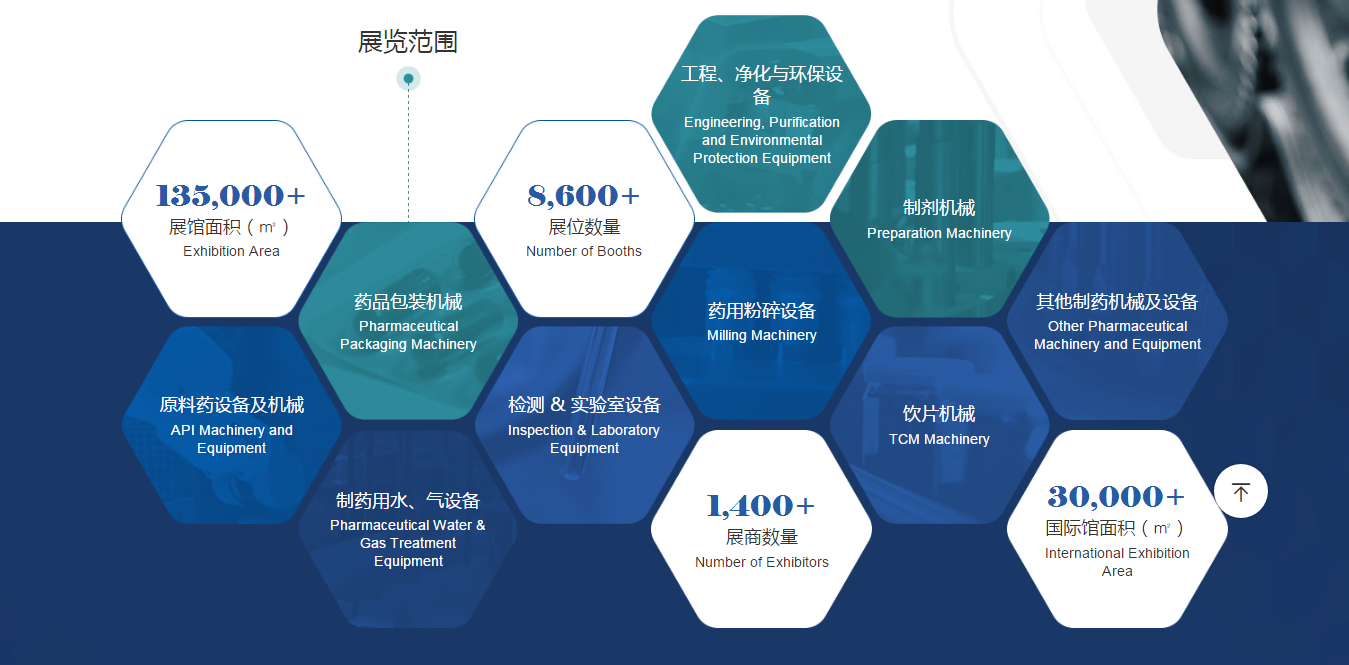 數超(chāo)過(guò)8600個,展出9大類(原(yuán)料藥機械/製劑(jì)機械/製藥用水、氣設備/藥用