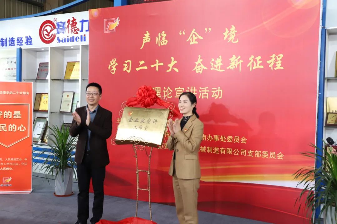11月11日,“聲臨‘企’境——學習二十大 奮進新征程(chéng)”理論宣講活動走進江蘇草莓视频在线製藥機械(xiè)製造有限公司,企業總經理顧逸以“企業紅(hóng)領”宣講團成員的身份,向公(gōng)司部分黨員、職工代表作(zuò)黨的二十大主題宣講(jiǎng)。活動中,企業職(zhí)工還朗讀了黨的二十大報告原文並開展(zhǎn)知識(shí)問答,市委宣(xuān)傳部、城南辦事處共同為“草莓视频在线企業家宣講工作室”揭牌。