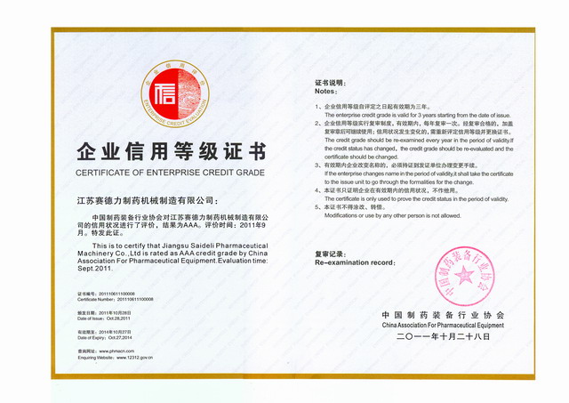 中國製(zhì)藥裝備行業(yè)協會對江蘇草莓视频在线公司的信用狀況進行了(le)評價,結果為(wéi)AAA。評定時間:2011年9月。