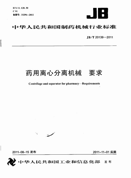 熱烈祝賀(hè)江蘇草莓视频在线製藥機械(xiè)製造有限公司成功製定由中華(huá)人民工和國工業和信息部2011-08-15發布、2011-11-07實施的中華人民共和國製藥機械行業標準(zhǔn)(JB/T20139-2011)--《藥用離心分離機械 要求》